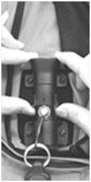 Draai deze vervolgens nog verder aan met de inbussleutel (meegeleverd). Ga hier langzaam mee door totdat het gat voor de insteekbus met de ring (uiteinde van de spiraalkabel) in de aluminium cilinder in het midden van het gat in het insteekapparaat kan worden geplaatst.